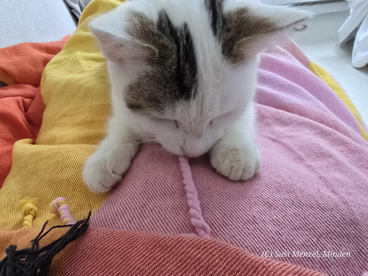 Kurz danach war die Maus vergessen und es dauerte nicht lange, bis der kleine weiß-schwarze Kater das Herz der Frauen erobert hatte. Bis zu dem Moment, als der Zwerg ins Wohnzimmer kam. Stolz schleppte er etwas braunes langes quer durch das Zimmer. Eine Besucherin hauchte leichenblass: „Eine Ratte. Er hat eine Ratte gefangen.“ Alle schrien auf, zogen blitzschnell die Beine hoch. Das Geschirr auf dem Tisch schepperte laut. Vor Schreck ließ der Kater seine Beute los – und ich rettete eine braune Socke, die er wieder einmal aus dem Kleiderschrank stibitzt hatte.